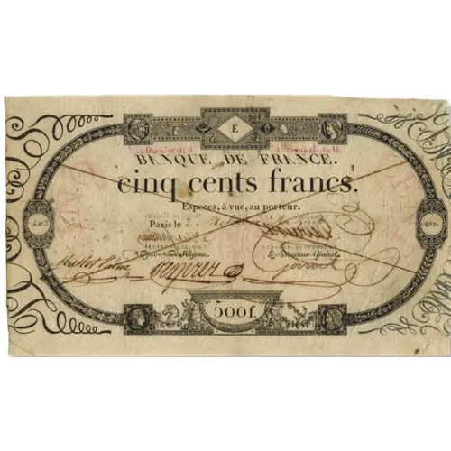 | Obverse lettering | E BANQUE DE FRANCE cinq cents francs. Especes, à vue, au porteur. Paris le, 11 Nivôse an huit Vu par Nous Régents Le directeur Générale 500f. |