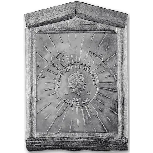 Window frame with right-facing head of Queen Elizabeth II wearing Girls of Great Britain and Ireland Tiara over crossed pickaxes. |