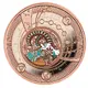 Multicolored goat (Capra sp.) head facing right on disc with zodiac signs and Moon phases. |