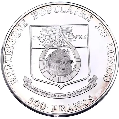 | 表面の銘文 | REPUBLIQUE POPULAIRE DU CONGO SANG DES HEROS SEMENCE DE LA REVOLUTION 500 FRANCS (Translation: Peoples Republic of Congo) |