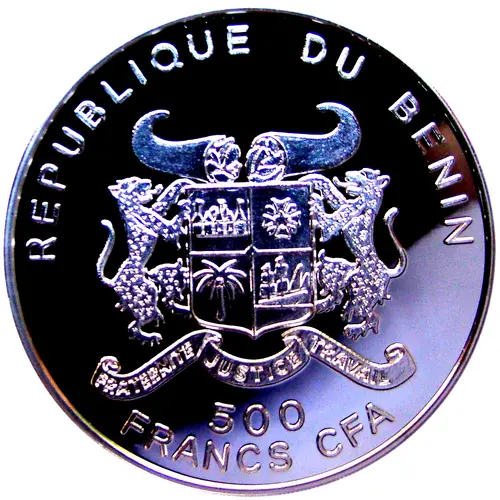 | Obverse description | Benin`s coat of arms: Two horns of plenty with ears of corn rising from them surmount a coat of arms around which are two panthers; below, the nation`s motto: `FRATERNITE JUSTICE TRAVAIL`. The whole is surrounded by the name of the country `REPUBLIQUE DU BENIN`, and the face value `500 FRANCS CFA`. |