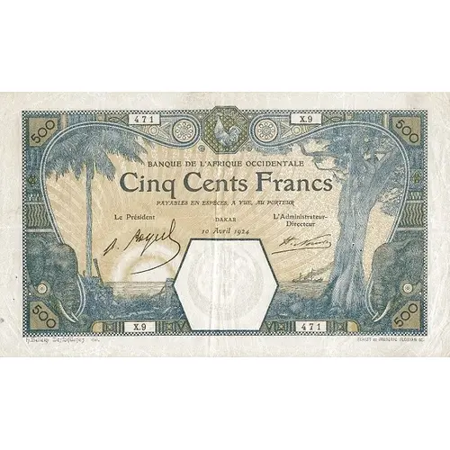 | Legenda do anverso | BANQUE DE L`AFRIQUE OCCIDENTALE CINQ CENT FRANCS PAYABLES EN ESPÈCES, A VUE, AU PORTEUR DAKAR h.Bellery Desfontaines del. ERNEST ET FREDERIC FLORIAN SC. |