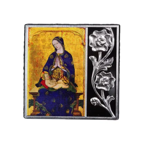 | Reverse description | Detail of `Enthroned Madonna Nursing The Child`, painted by Maestro dei Polittici Crivelleschi in 1489, roses at right. |