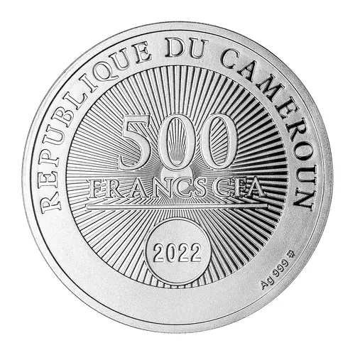 | Obverse lettering | REPUBLIQUE DU CAMEROUN 500 FRANCS CFA 2022 Ag 999 mw (Translation: Republic of Cameroon.) |