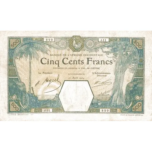 | Obverse lettering | BANQUE DE L`AFRIQUE OCCIDENTALE CINQ CENT FRANCS PAYABLES EN ESPÈCES, A VUE, AU PORTEUR GRAND-BASSAM h.Bellery Desfontaines del. ERNEST ET FREDERIC FLORIAN SC. |