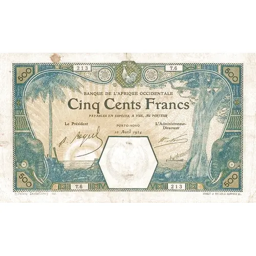 | Obverse lettering | BANQUE DE L`AFRIQUE OCCIDENTALE CINQ CENT FRANCS PAYABLES EN ESPÈCES, A VUE, AU PORTEUR PORTO-NOVO h.Bellery Desfontaines del. ERNEST ET FREDERIC FLORIAN SC. |