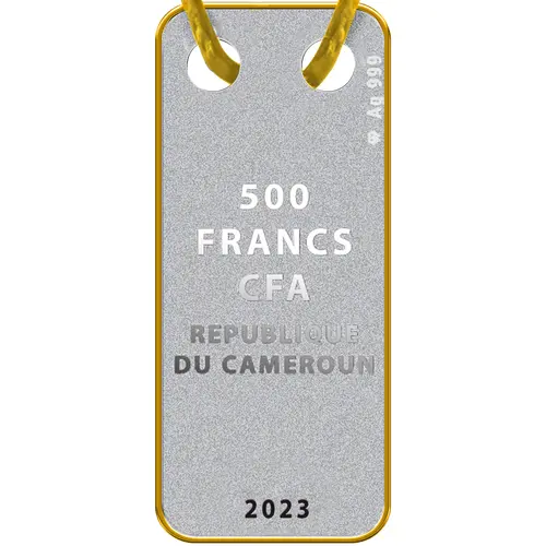 | Надписи аверса | 500 FRANCS CFA REPUBLIQUE DU CAMEROUN 2023 mw Ag 999 (Translation: Republic of Cameroon.) |