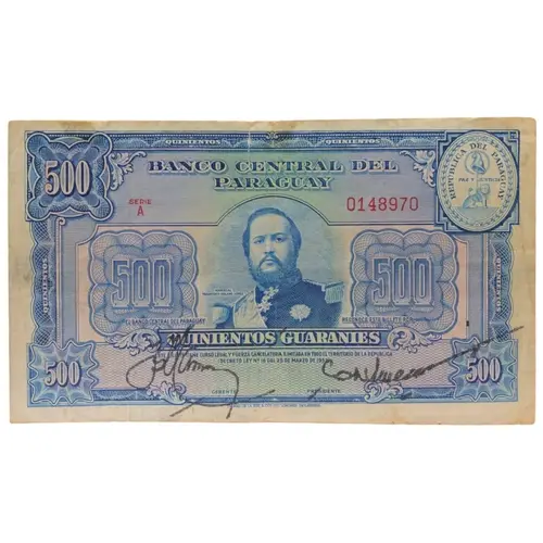 | Obverse lettering | BANCO CENTRAL DEL PARAGUAY 500 EL BANCO CENTRAL DEL PARAGUAY RECONOCE ESTE BILLETE POR QUINIENTOS GUARANIES ESTE BILLETE TIENE CURSO LEGAL Y FUERZA CANCELATORIA ILIMITADA EN TODO EL TERRITORIO DE LA REPUBLICA (DECRETO LEY N. 18 DEL 25 DE MARZO DE 1952). (Translation: Central Bank of Paraguay The Central Bank of Paraguay recognizes this banknote for Five Hundred Guaranies This banknote has legal course and unlimited cancellation force throughout the territory of the Republic (Decree-Law # 18 of March 25th., 1952).) |