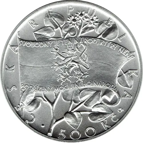 | Obverse lettering | ČESKÁ REPUBLIKA • 500 KČ ČM SVOBODNÝ JE TEN NÁROD, KTERÝ NENÍ PODŘÍZENÝ MOCI JINÉHO NÁRODA (Translation: CZECH REPUBLIC • 500 CZK CM FREE IS THAT NATION THAT IS NOT SUBORDINATED TO ANOTHER NATION) |