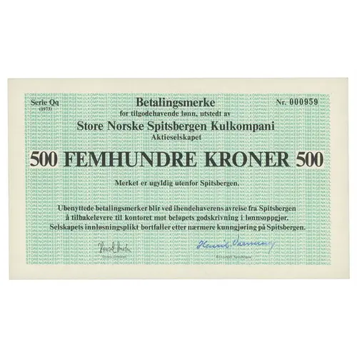 Betalingsmerke for tilgodehavende lønn, utstedt av Store Norske Spitsbergen Kulkompani Aktieselskap 500 FEMHUNDRE KRONER 500 Merket er ugyldig utenfor Spitsbergen. Ubenyttede betalingsmerker blir ved ihendehaverens avreise fra Spitsbergen å tilbakelevere til kontoret mot beløpets godskrivning i lønnsoppgjør. Selskapets innløsningsplikt bortfaller etter nærmere kunngjøring på Spitsbergen. Styrets formann Kontorsjef Spitsbergen (Translation: Payment note issued by The Great Norwegian Spitsbergen Coal Company for due wages 500 kroner The note is invalid outside Spitsbergen. Unused payment notes must be returned upon the holder`s departure from Spitsbergen to the office againt the amount being credited on the payroll. The company`s obligation ceases after further announcement on Spitsbergen. Chairman of the board. Office manager, Spitsbergen.) |