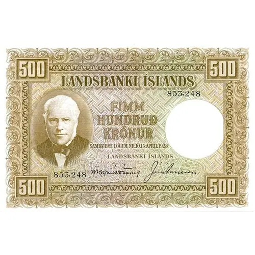 500 LANDSBANKI ÍSLANDS 500 FIMM HUNDRAÐ KRÓNUR SAMKVÆMT LÖGUM NR 10 15. APRIL 1928 LANDSBANKI ÍSLANDS 500 500 (Translation: National Bank of Iceland Five hundred Krónur According to Law No. 10 15. April 1928 National Bank of Iceland) |