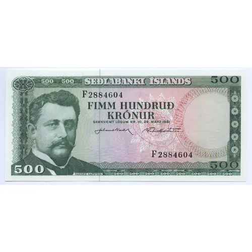 500 500 SEÐLABANKI ÍSLANDS 500 serialnumber FIMM HUNDRUÐ KRÓNUR SAMKVÆMT LÖGUM NR. 10. 29. MARZ 1961 Signatures serialnumber 500 Hannes Hafstein 500 (Translation: Five Hundred Krónur According to Law No. 10. 29 March 1961) |