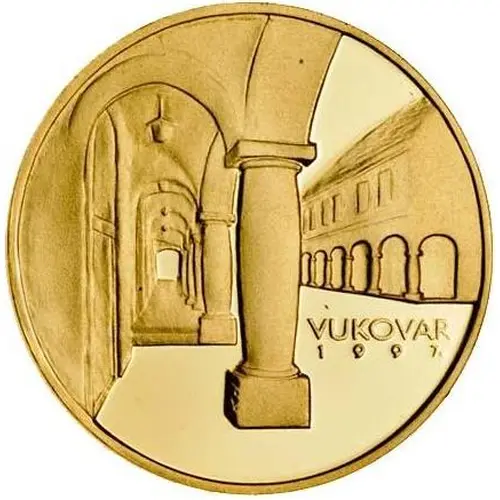 | Mô tả mặt trước | Representation of the inner city core of Vukovar, dominated by buildings with recognizable Baroque elements. In the lower half of the coin, on the right side, the text `VUKOVAR`, below which is the year of minting `1997`. |