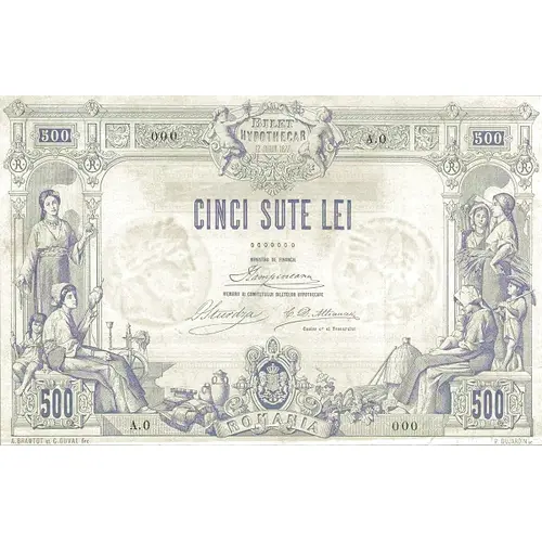 BILET HYPOTHECAR 12 JUNIU 1877. 500 500 CINCI SUTE LEI MINISTRU DE FINANCIE MEMBRII AI COMITETULUI BILETELOR HIPOTHECARE Casier cal al Tesaurului ROMANIA 500 500 A. BRAMTOT et G. DUVAL fec. P. DUJARDIN sc. |