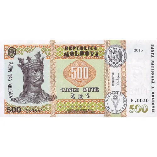 | Obverse lettering | REPUBLICA MOLDOBA STEFAN CEL MARE 500 CINCI SUTE LEI GUVERNATOR 500 FALSIFICAREA ACESTOR BILETE SE PEDEPSESTE CONFORM LEGILOR PE-UN PICIOR DE PLAI, PE-O GURA DE RAI... 500 2015 BANCA NATIONALA A MOLDOVEI (Translation: Republic of Moldova Stephen the Great 500 500 Lei Governor 500 Counterfeiting this Banknote is Punishable by the Law On a Feet of Way, On a Mouth of Heaven... 500 2015 National Bank of Moldova) |