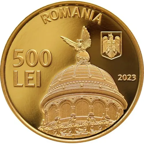 The dome of the palace of the Assembly of Deputies in Bucharest during the interwar period, the inscription “ROMANIA” in an arc, the face value “500 LEI”, the coat of arms of Romania and the year of issue “2023”. |