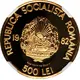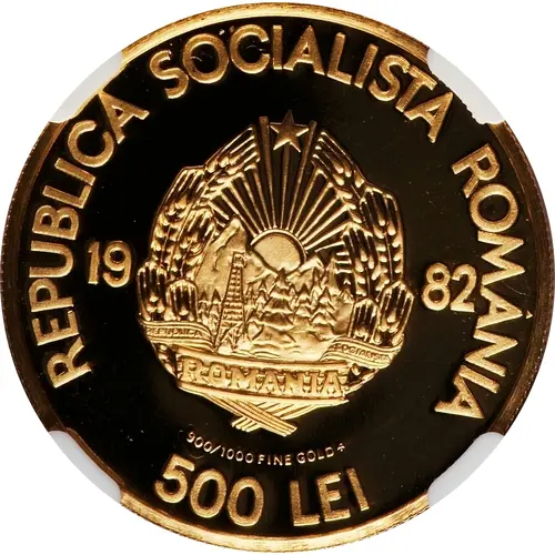 | Obverse lettering | REPUBLICA SOCIALISTA ROMANIA 1982 900/1000 FINE GOLD 500 LEI (Translation: Socialist Republic of Romania) |