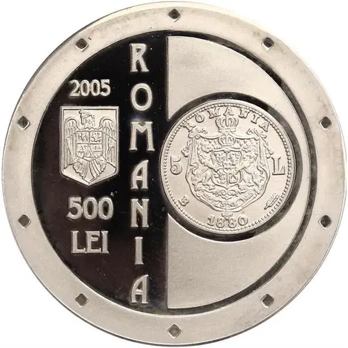On the left side, the year of issue `2005`, Romania`s coat-of-arms and the face value `500 LEI`. The inscription `ROMANIA` is engraved vertically in the middle. The right side features the first silver coin issued according to the standards of the Latin Union by the National Bank of Romania in 1880, the year of its establishment. |