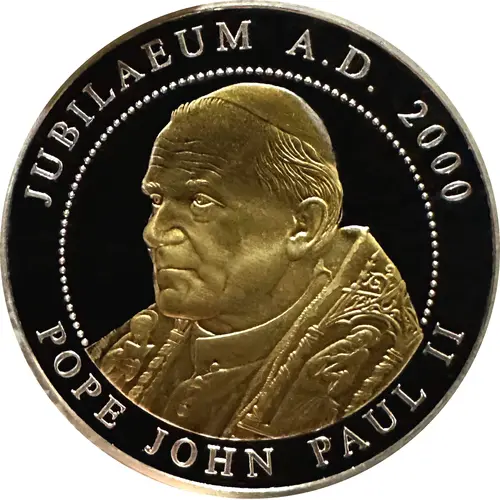 Artistry: The coin's design features a dignified portrait of Pope John Paul II on the obverse, rendered in a realistic, contemporary style typical of early 21st-century commemorative coinage. The distinctive selective gold plating, applied specifically to the Pope's portrait, elevates the central figure, creating a striking visual contrast against the silver field. This technique emphasizes the spiritual significance of the subject, drawing the viewer's eye directly to the pontiff's likeness. The execution suggests a skilled hand capturing the Pope's recognizable features with reverence.