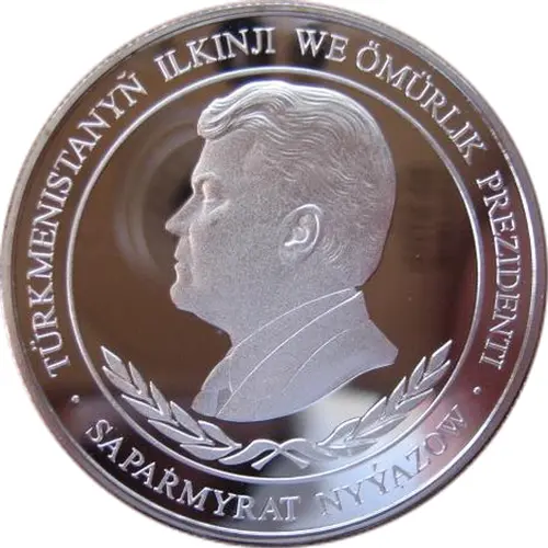 | Ön yüz lejandı | TÜRKMENISTANYŇ ILKINJI WE ÖMÜRLIK PREZIDENTI ∙ SAPARMYRAT NYÝAZOW ∙ (Translation: The first and lifelong President of Turkmenistan Saparmurat Niyazov) |