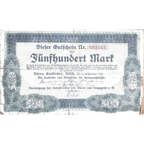 | Obverse lettering | Dieser Gutschein Nr. 482158 über Fünfhundert Mark ist durch hinterlegung von Reichsfchabanmeifunger gedet. Er wird von den kommunalen kassen und sparkassen sowie den banten der kreise Düren, Euskirchen, und Jülich in Zahlung genommen. der schein verliert seine gültigkeit mit ablauf von 2 wochen nach ausrus in den amtlichen kreisblättern der genannten drei kreise. Düren, Euskirchen, Jülich, den 16. September 1922. Die landräte und mitglieder der kreisausschüsse: Vereinigung der industriellen von Düren und umgegend e. A. I. vorsikender: kommunalverbändeder kreise |
