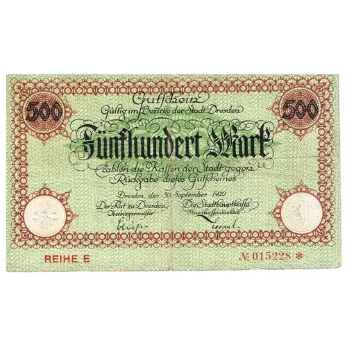 | Obverse lettering | Gutschein Gültig im Bezirke der Stadt Dresden Fünfhundert Mark zahlen die Kassen der Stadt Dresden gegen Rückgabe dieses Gutscheines Dresden, den 30. September 1922 |