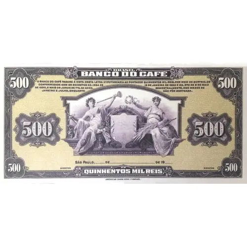 | Obverse lettering | BRASIL 500 BANCO DO CAFÉ 500 O BANCO DO CAFÉ PAGARÁ Á VISTA DESTA LETRA HYPOTHECÁRIA AO PORTADOR CEM MIL REIS, POR MEIO DE SORTEIO, DE CONFORMIDADE COM OS DECRETOS Nº 169A DE 19 DE JANEIRO DE 1890 E Nº 370 DE 2 DE MAIO DE 1890, E MAIOS OS JUROS DE 7% AO ANNO, SEMESTRALMENTE, NOS MEZES DE JANEIRO E JULHO, EMQUANTO NÃO FÔR SORTEADA. 500 500 São Paulo, ____ DE __________________ DE 19___. DIRECTOR DIRECTOR 500 QUINHENTOS MIL REIS 500 AMERICAN BANK NOTE COMPANY. (Translation: Brazil 500 Bank of Coffee 500 The Bank of Coffee will pay at the sight of this mortgage letter to the carrier one hundred thousand Réis, through luck, in compliance with decree No. 169a of January 19, 1890, and No. 370 of May 2, 1890, and May the interest of 7 % per year, semiannually, in the middle of January and July, while it was not lucky. 500 500 São Paulo, ____ of __________________ of 19___. Director Director 500 Five hundred thousand Réis 500 American Bank Note Company.) |