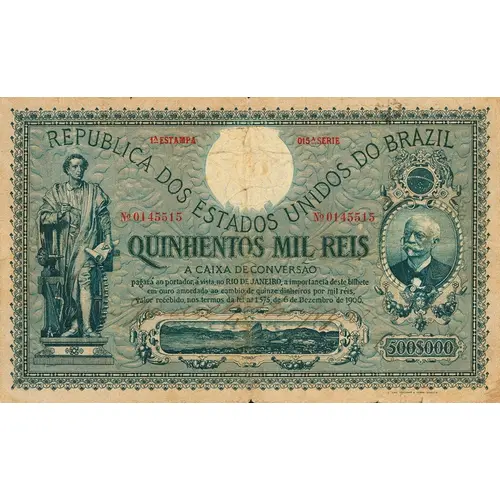 | Obverse lettering | REPÚBLICA DOS ESTADOS UNIDOS DO BRAZIL QUINHENTOS MIL RÉIS A CAIXA DE CONVERSÃO Pagará ao Portador á vista, no Rio de Janeiro a importância deste bilhete em ouro amoedado ao cambio em quinze dinheiros por Mil Réis, valor recebido nos termos da lei n. 1575 de 6 de Dezembro de 1906. 500$000 Joh Enschede en Zonen, Holanda (Translation: Republic of the United States of Brazil Five Thousand Mil Reis The Conversion Fund will pay the bearer in cash, in Rio de Janeiro, the amount of this gold-plated ticket in exchange for fifteen money per Mil Reis amount received under the terms of law no. 1575 of December 6, 1906. Joh Enschede en Zonen, Netherlands) |
