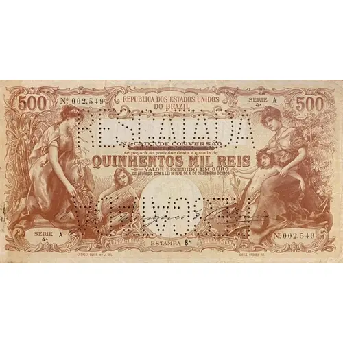 | Obverse description | Dark red on ochre, in lithography (overprinted on 8th print of Thesouro Nacional - P#85 `NA CAIXA DE CONVERSÃO (...) OURO - DE ACORDO COM A LEI Nº 1.575 - 6 DEZ 1906`). To the right and left, figures of women and children (Allegory of Commerce and Agriculture); in the center, blank spaces with watermarks - `QUINHENTOS MIL RÉIS` and `women`s head`. Print, series and order numbers in black. |