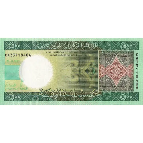 (Translation: Central Bank of Mauritania, 500 Five Hundred Ouguiya)
