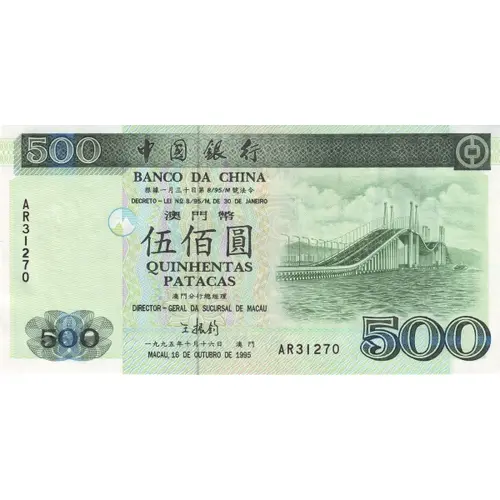 | Obverse lettering | 中國銀行 BANCO DA CHINA 根據 一月十八日第 8/95/M 號法令 DIRECTO – LEI № 8/95/M, DE 30 DE JANEIRO 澳門幣 伍佰圓 QUINHENTAS PATACAS 澳門分行總經理 DIRECTOR - GERAL DA SUCURSAL DE MACAU 一九九五年十月十六日 澳 門 MACAU, 16 DE OUTUBRO DE 1995 (Translation: Bank of China According to Decree No. 8/95/M of January 30 Macanese currency Five Hundred Patacas Macau Branch General Manager 1995 October 16 Macau) |