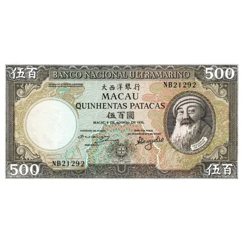 BANCO NACIONAL ULTRAMARINO 大西洋銀行 MACAU QUINHENTAS PATACAS 伍百圓 MACAU, 8 DE AGOSTO DE 1981. CONSELHO DE GESTÃO | DIRECTOR GERAL / DO DEPARTAMENTO DE MACAU PRESIDENTE VENCESLAU DE MORAIS |