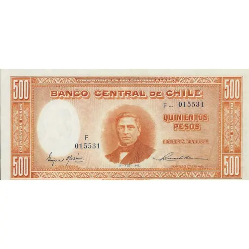 | Obverse lettering | CONVERTIBLES EN ORO CONFORME A LA LEY BANCO CENTRAL DE CHILE QUINIENTOS PESOS CINCUENTA CONDORES 18 - VIII - 1943. TALLERES DE ESPECIES VALORADAS. SANTIAGO, CHILE. (Translation: Convertible into Gold in Conformity with the Law Central Bank of Chile Five Hundred Pesos Fifty Condores August 18, 1943.) |