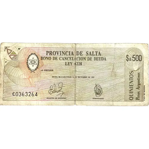 PROVINCIA DE SALTA BONO DE CANCELACION DE DEUDA LEY 6228 AL PORTADOR FECHA DE CADUCIDAD: 31 DE DICIEMBRE DE 1987. QUINIENTOS Pesos Argentinos (Translation: Salta Province debt cancellation bond law 6228 To the carrier Date of expiry: 31st of December 1987 FIVE HUNDRED Pesos Argentinos) |