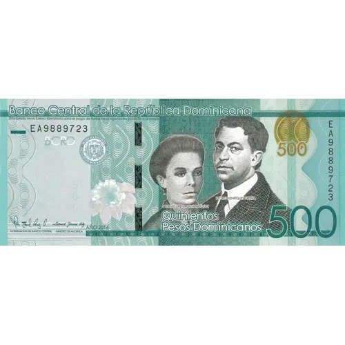 Banco Central de la República Dominicana 500 Banco Central de la República Dominicana 500 Quinientos Pesos Dominicanos 500 (Translation: Central Bank of the Dominican Republic 500 Central Bank of the Dominican Republic 500 Five Hundred Pesos Dominicanos 500) |