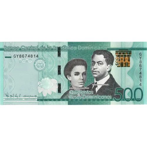 | Obverse lettering | Banco Central de la República Dominicana Este billete tiene fuerza liberatoria para el pago de todas las obligaciones públicas o privadas Quinientos Pesos Dominicanos (Translation: Central Bank of the Dominican Republic This note is valid for all debts, public or private. Five Hundred Pesos Dominicanos) |