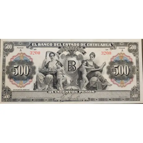 | Obverse lettering | El Banco Del Estado De Chihuahua Pagara al portador en efectivo segun decreto del 12 de diciembre de mil novecientos trece. Quinientos Pesos Valor oro nacional (Translation: The State Bank of Chihuahua It will pay the bearer in cash according to the decree of December 12, one thousand nine hundred and thirteen. 500 Pesos National gold value) |