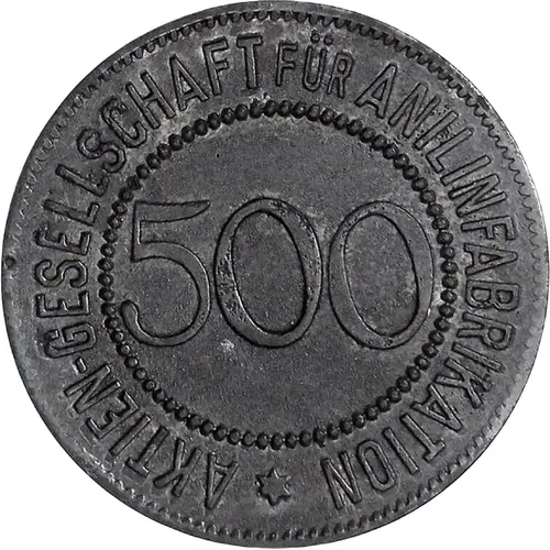 | Obverse lettering | AKTIEN-GESELLSCHAFT FÜR ANILINFABRIKATION 500 |