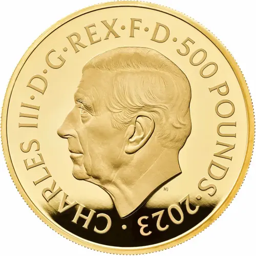 | Ön yüz lejandı | CHARLES III·D·G·REX·F·D·500 POUNDS·2023· MJ (Translation: Charles the Third by the Grace of God King Defender of the Faith) |