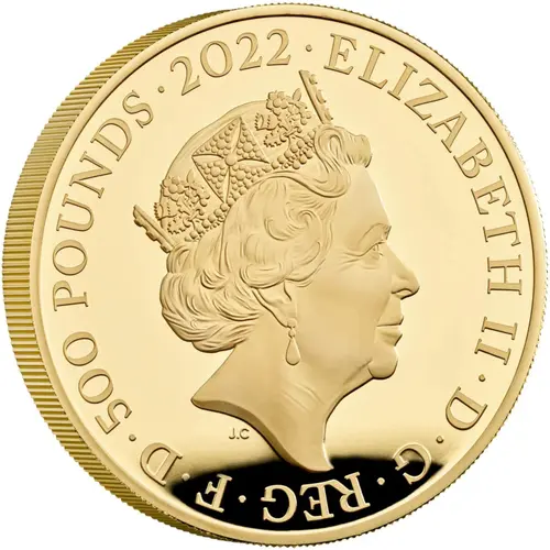 | Legenda del dritto | ELIZABETH II·D·G·REG·F·D·500 POUNDS·2022· J.C (Translation: Elizabeth the Second by the Grace of God Queen Defender of the Faith) |