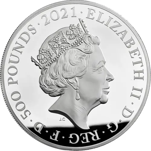 | Obverse lettering | ELIZABETH II·D·G·REG·F·D·500 POUNDS·2021· J.C (Translation: Elizabeth the Second by the Grace of God Queen Defender of the Faith) |