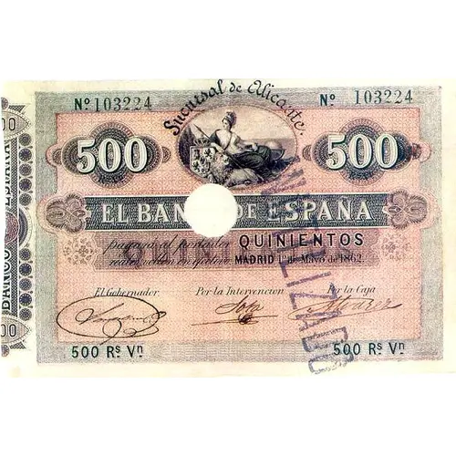 500 EL BANCO DE ESPAÑA pagará al portador QUINIENTOS reales vellón en efectivo MADRID 1º de Mayo de 1862. El Gobernador Por la Intervencion Por la Caja (Translation: The Bank of Spain will pay the bearer Five Hundred Reales vellon in cash Madrid, May 1, 1862. The Governor For the Intervention For the Cash) |