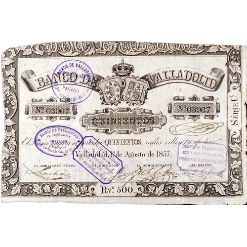 BANCO DE VALLADOLID QUINIENTOS El Banco pagará al portador QUINIENTOS reales vellon en efectivo Valladolid 1º de Agosto de 1857 EL COMISARIO REGIO / EL DIRECTOR / EL ADMINISTRADOR / EL CAJERO RVn 500 (Translation: Bank of Valladolid Five Hundred will pay the bearer Five Hundred Reales Vellon in cash Valladolid, 1st of August 1857 The Royal Commissioner / The Director / The Administrator / The Cashier) |