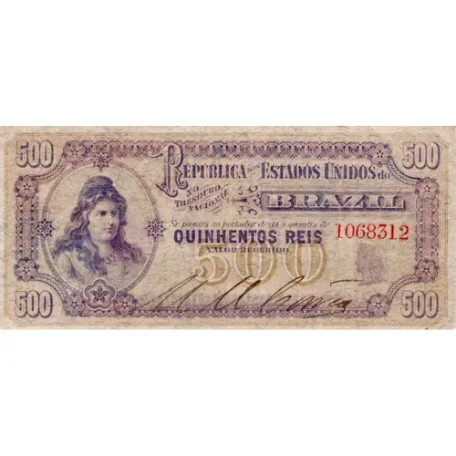 | Obverse lettering | República dos Estados Unidos do BRAZIL No Thesouro Nacional se pagará ao portador desta a quantia de QUINHENTOS REIS VALOR RECEBIDO 500 (Translation: Republic of the United States of Brazil At the National Treasury The bearer of this will be paid the amount of Five hundred Reis Received value 500 República de los Estados Unidos de Brasil En el Tesoro Nacional El portador de éste será pagado la cantidad de Quinientos Reis Valor recibido 500) |