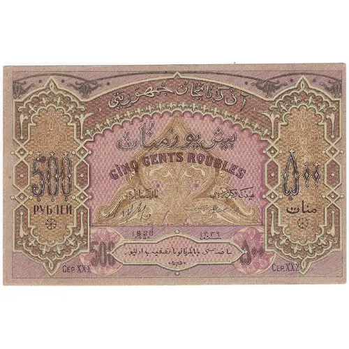 | Vorderseitenlegende | آزربايجان جومهوریتی بيش يوز منات CİNQ CENTS ROUBLES 500 ۵۰۰ РУБЛЕЙ منات (Translation: Republic of Azerbaijan, Five Hundred Roubles, Five Hundred Manat) |