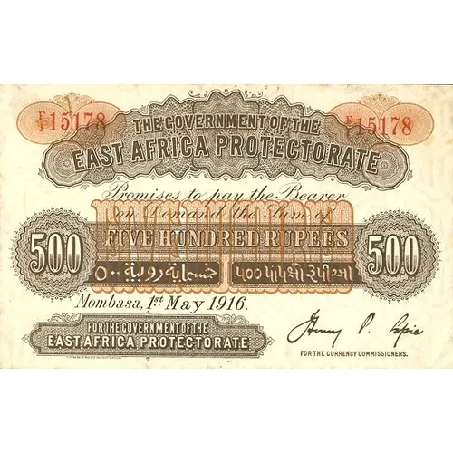 | Obverse lettering | THE GOVERNMENT OF THE EAST AFRICA PROTECTORATE PROMISES TO PAY THE BEARER ON DEMAND THE SUM OF FIVE HUNDRED RUPEES FOR THE GOVERNMENT OF THE EAST AFRICA PROTECTORATE |