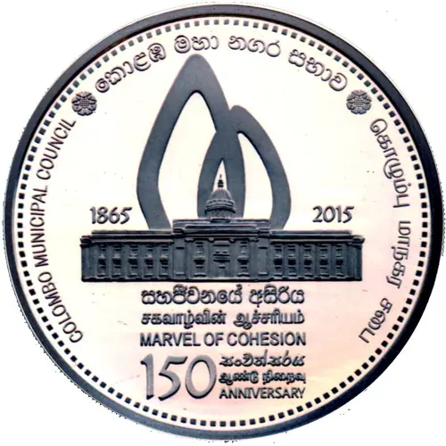 Official logo of 150th Anniversary with image of Colombo Town Hall with 1865 and 2015 above on left and right. Below සහජීවනියේ අසිරිය in Sinhala, சகவாழ்வின் ஆச்சர்யம் in Thamil, and MARVEL OF COHESION in 3 lines and at bottom large numeric 150 සංවත්සරය in Sinhala ஆண்டுநிறைவு in Thamil and ANNIVERSARY right of numeric. කොළඹ මහා නගර සභාව in Sinhala on top, கொழும்பு மாநகர சபை in Thamil on the right, and COLOMBO MUNICIPAL COUNCIL on left with two lotus to separate. All within a circle of dots along the periphery with raised rim. |