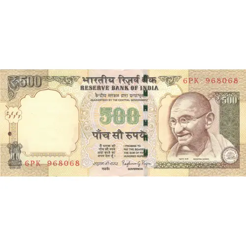 भारतीय रिजर्व बैंक केंद्रीय सरकार द्वारा प्रत्याभूत पाँच सौ रुपये (Translation: RESERVE BANK OF INDIA GUARANTEED BY THE CENTRAL GOVERNMENT Five Hundred Rupees I PROMISE TO PAY THE BEARER THE SUM OF FIVE HUNDRED RUPEES) |