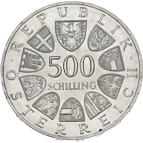 | Obverse lettering | · REPUBLIK · 500 SCHILLING ÖSTERREICH |