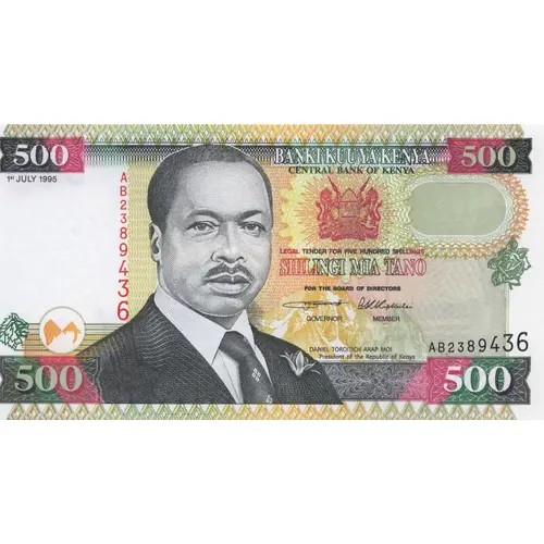 500 BANK KUU YA KENYA CENTRAL BANK OF KENYA HARAMBE LEGAL TENDER FOR FIVE HUNDRED SHILLINGS SHILINGI MIA TANO FOR THE BOARD OF DIRECTORS DANIEL TOROITICH ARAP MOI PRESIDENT OF THE REPUBLIC OF KENYA (Translation: Central Bank of Kenya All pull together Five hundred shillings) |